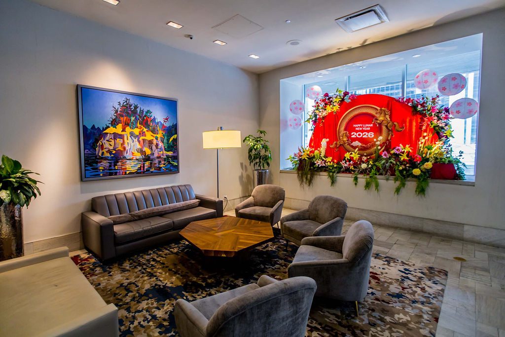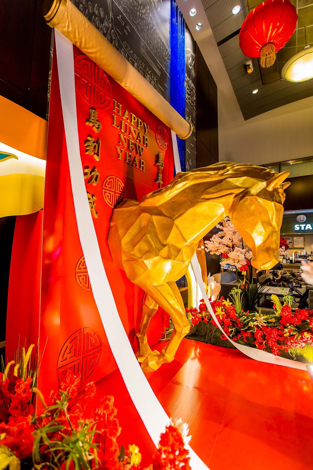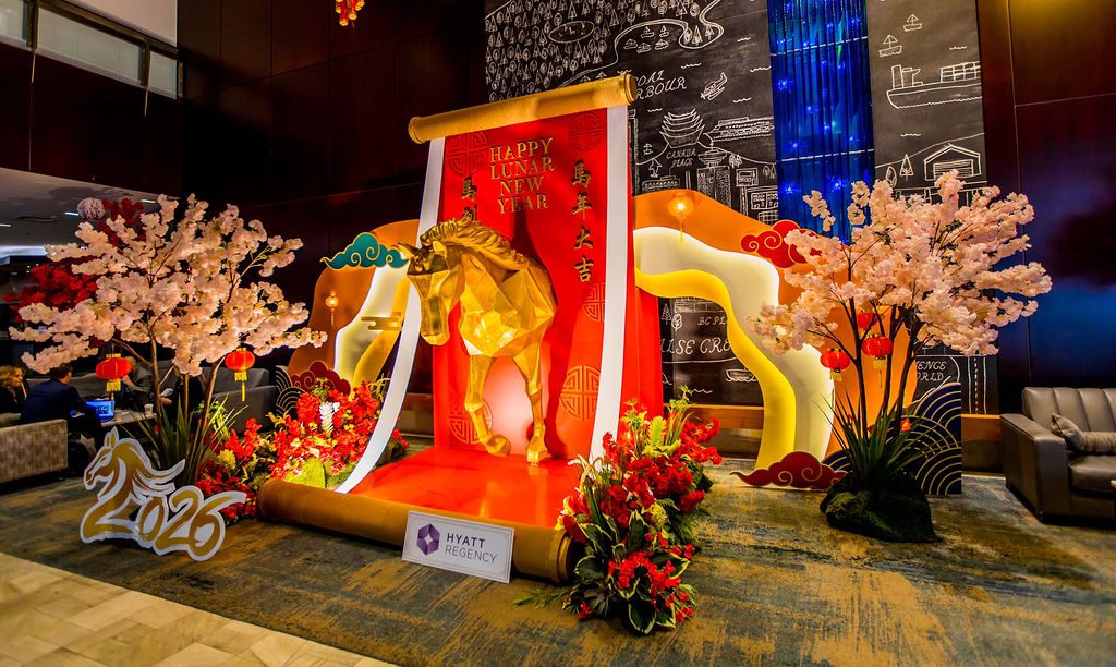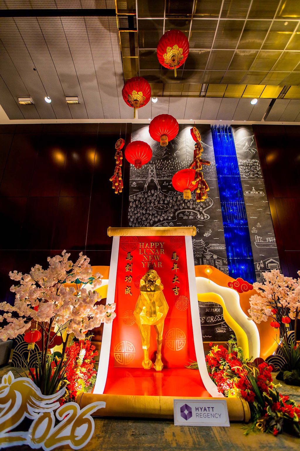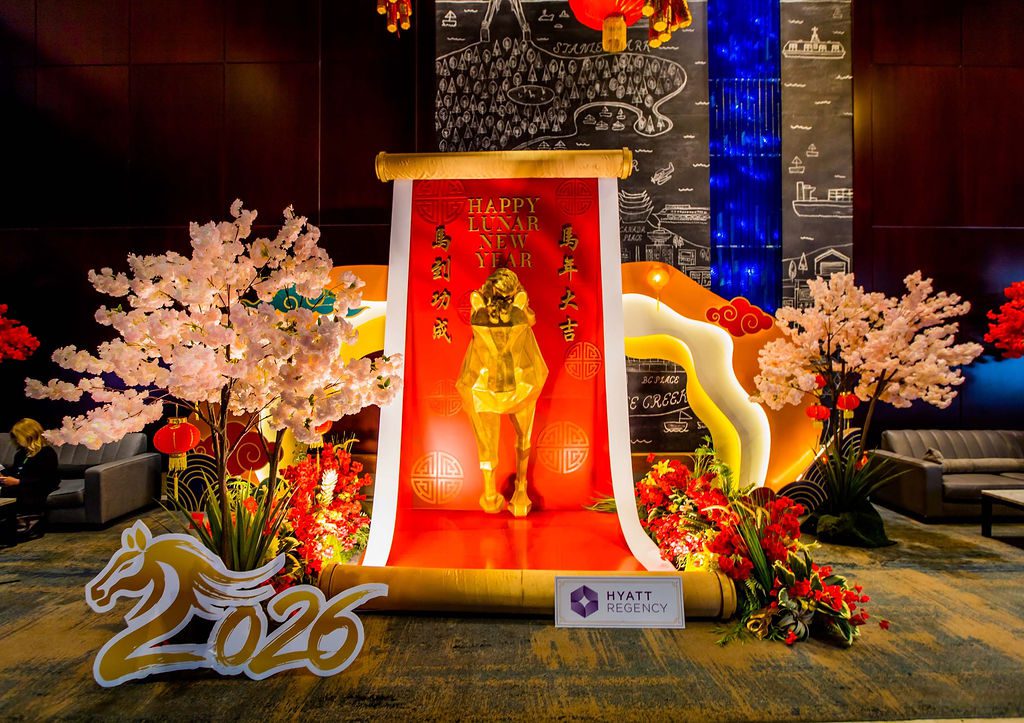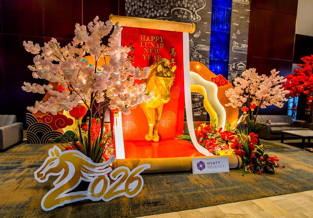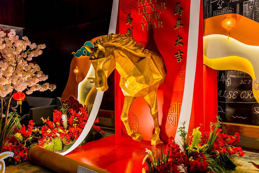 When Team Hyatt connected with us for the upcoming Year of the Fire Horse in December last year, just after we completed a successful Gingerbread Lane project, our team didn’t miss a beat. We quickly sought inspiration from various online design platforms, adhering to our standard goal of being inspired and then developing our own unique brand look. By January, we finalized our concept: a majestic golden horse suspended mid-air inside a traditional Asian scroll, gradually unfurling. This life-sized installation measured approximately 12 feet in length and 8 feet in height, intended to be gracefully displayed in the hotel’s grand lobby. To enhance realism, we adorned the bottom of the scroll with a lush garland of premium blooms and vibrant greens, leaving the floor beneath the horse free of obstructions and coated in a glossy red finish. The installation was surrounded by tall cherry blossom trees that created an inviting environment, making the space perfect for guest photo opportunities.