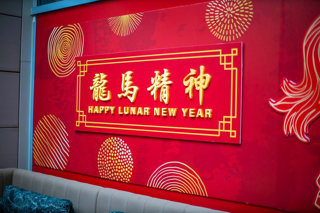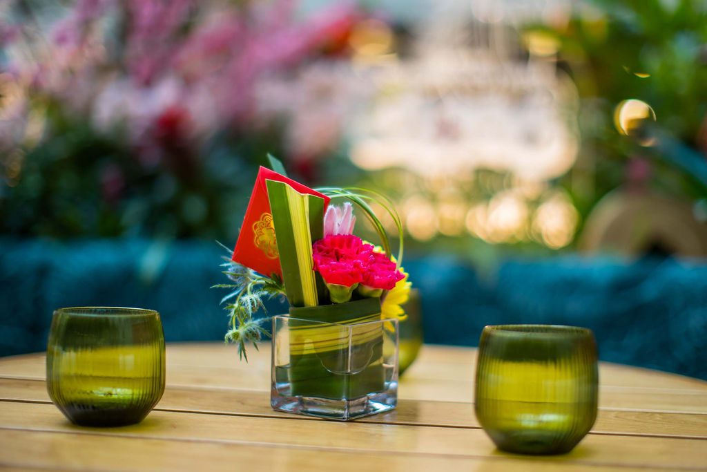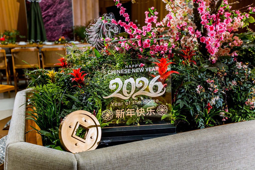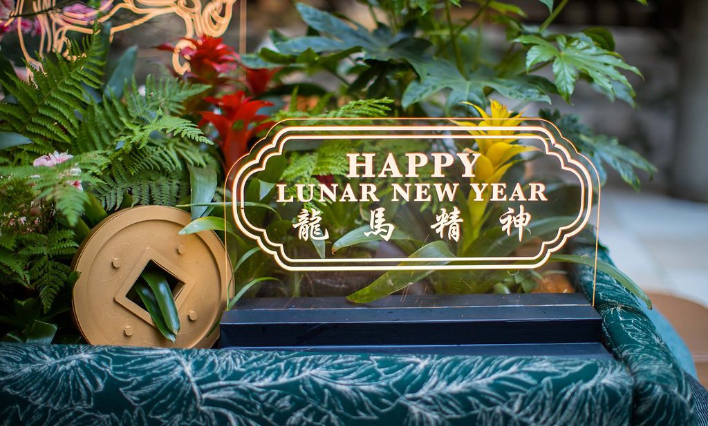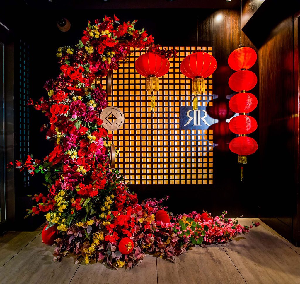 Our design showcased four clear glass LED-lit signages with custom-crafted gold coins, perfectly integrated into two large planter boxes. We also added dozens of hanging lanterns, a stunning dragon head adorned with umbrellas above the bar, and two of our favorite creations—charming Asian-inspired centerpieces for their 35 service tables. The grand floral armature at the Welcome Floor, dressed in shades of red with lush florals, greens, hanging lanterns, and three gold coins, truly transformed the space into something spectacular.