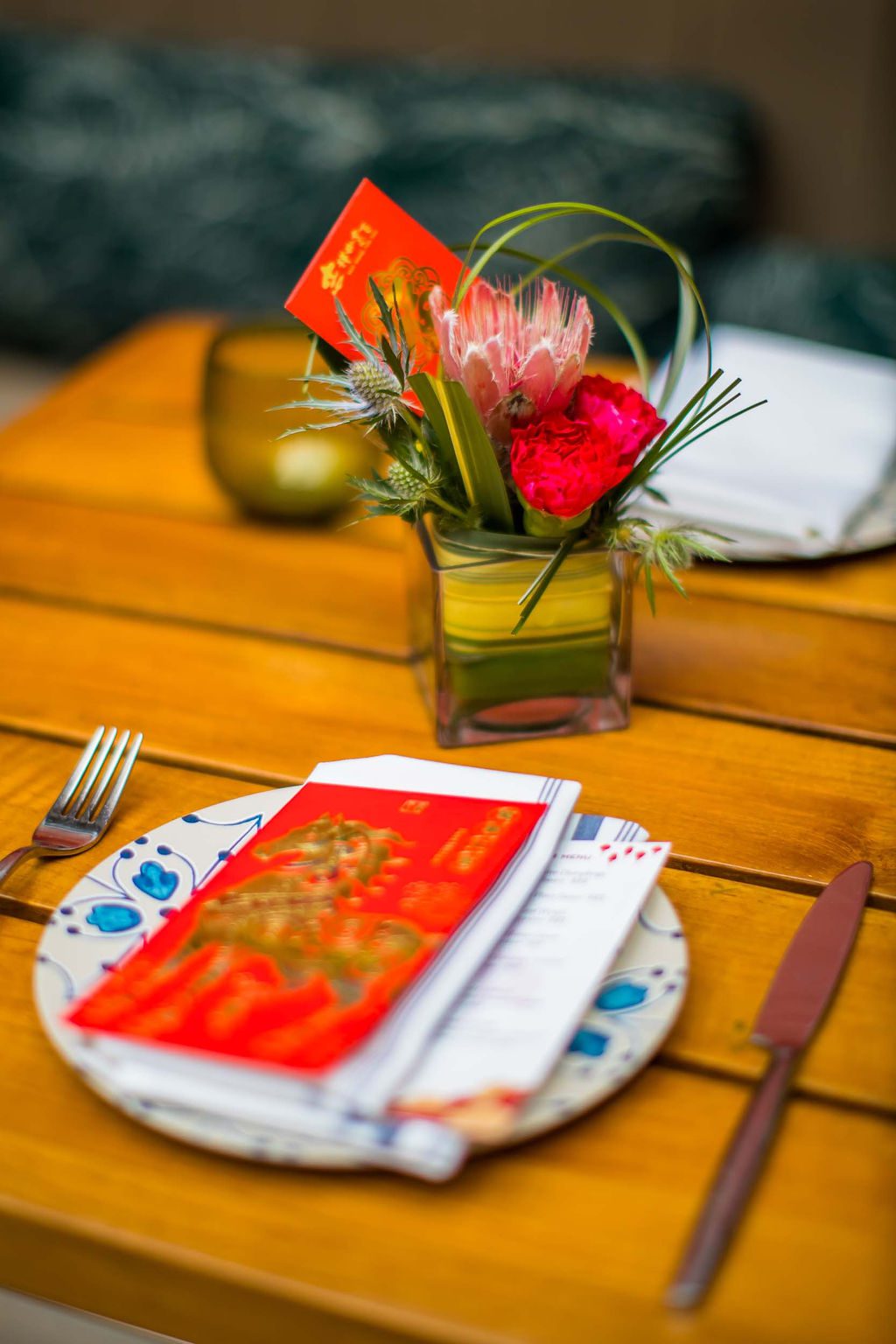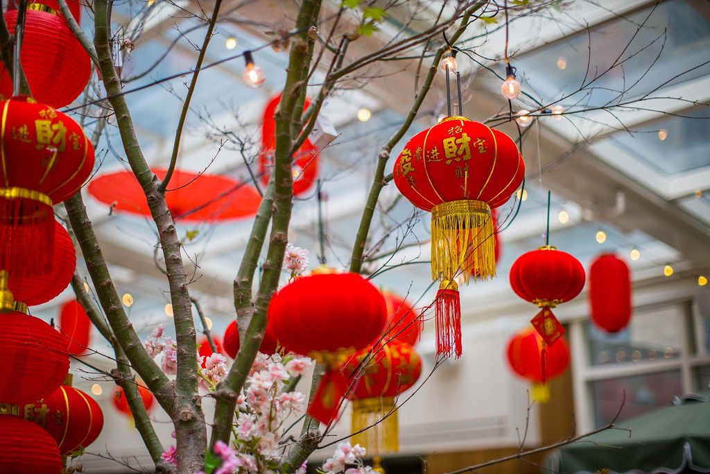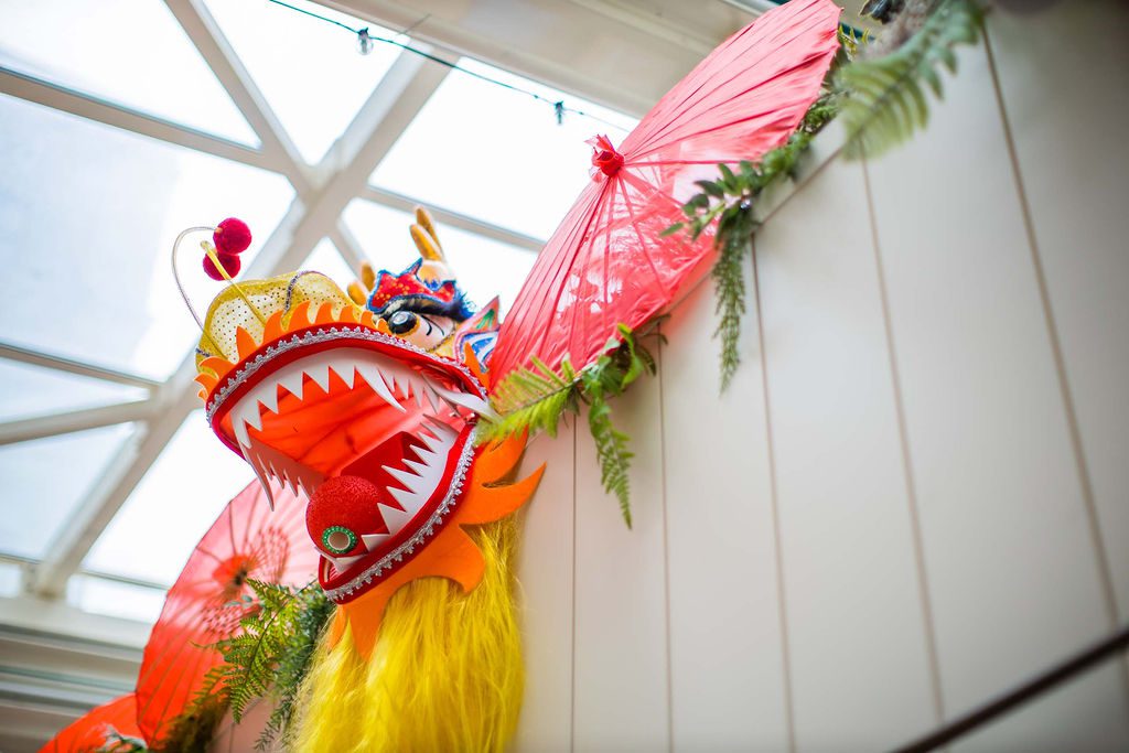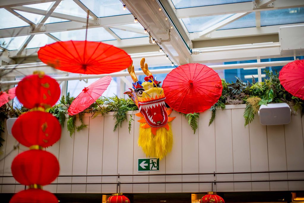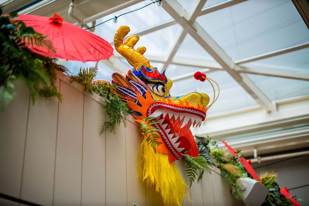 Our design showcased four clear glass LED-lit signages with custom-crafted gold coins, perfectly integrated into two large planter boxes. We also added dozens of hanging lanterns, a stunning dragon head adorned with umbrellas above the bar, and two of our favorite creations—charming Asian-inspired centerpieces for their 35 service tables. The grand floral armature at the Welcome Floor, dressed in shades of red with lush florals, greens, hanging lanterns, and three gold coins, truly transformed the space into something spectacular.